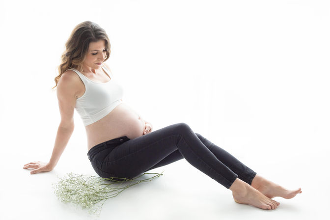 La lumière studio permet de créer des images modernes et raffinées, de sculpter les courbes de la future maman et de révéler avec délicatesse textures et traits.